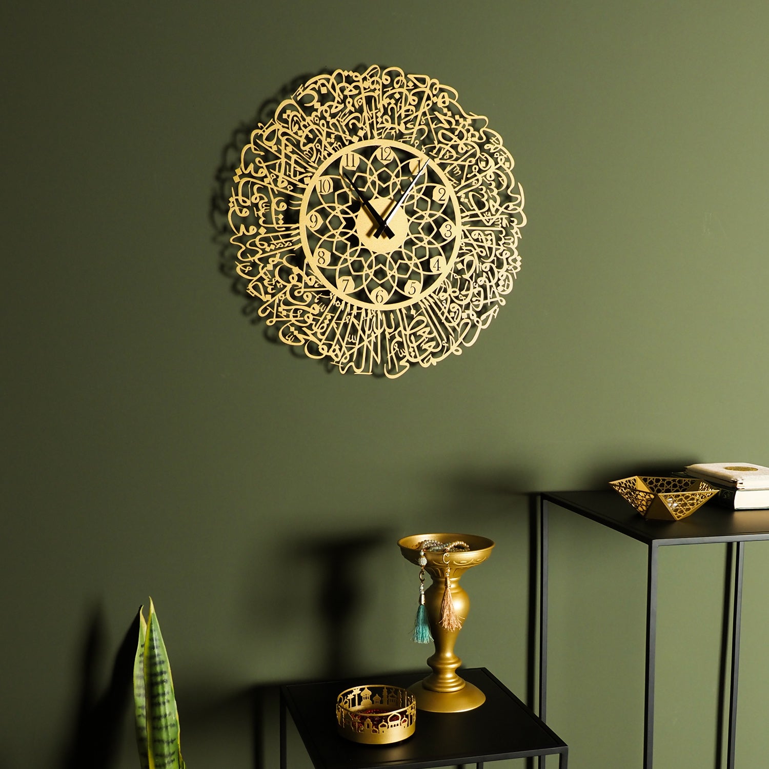 Gold Metal Ayatul Kursi Islamic Wall Clock with Arabic Calligraphy for Muslim Homes