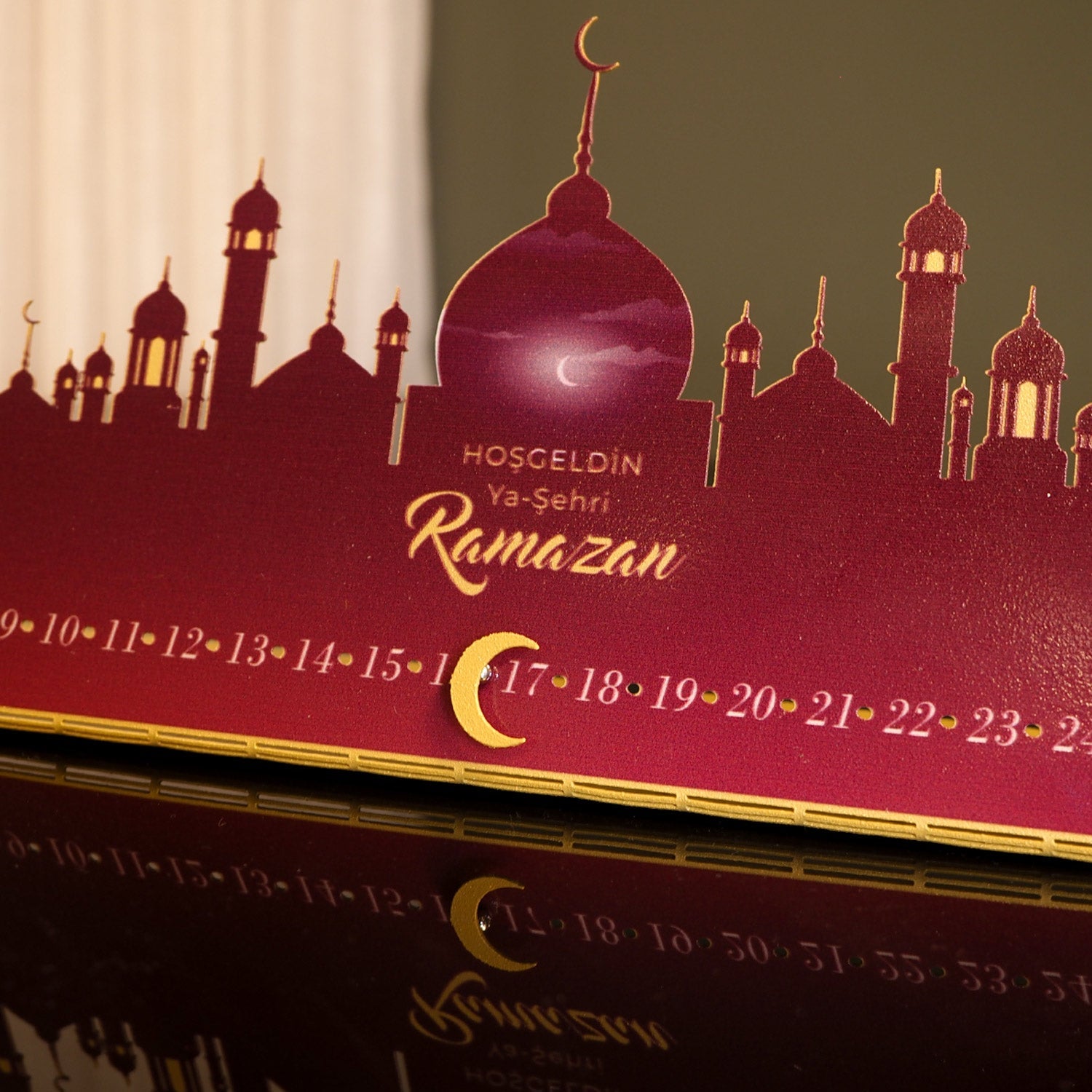 The product arrives flat; its form is shaped by the user through a simple bending process. Thanks to the magnet placed at the base, the crescent moves forward each day, allowing the days of Ramadan to be followed one by one. This small daily action becomes a meaningful ritual—gently reminding that a new day has begun.