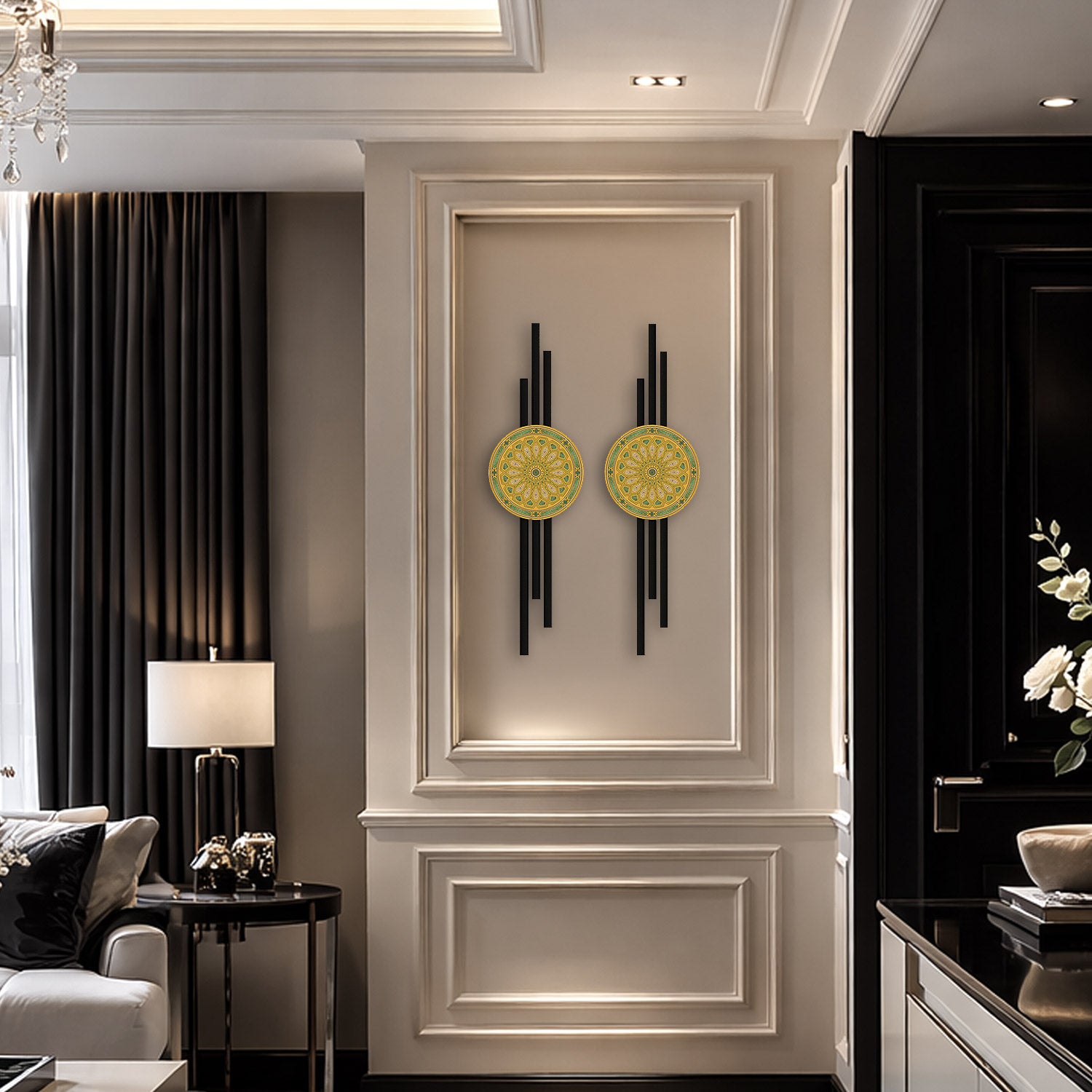 The central motif symbolizes order and unity, while the vertical forms evoke elevation, direction, and inner balance. It is a timeless interpretation for those who seek not only aesthetics, but meaning within their living space.