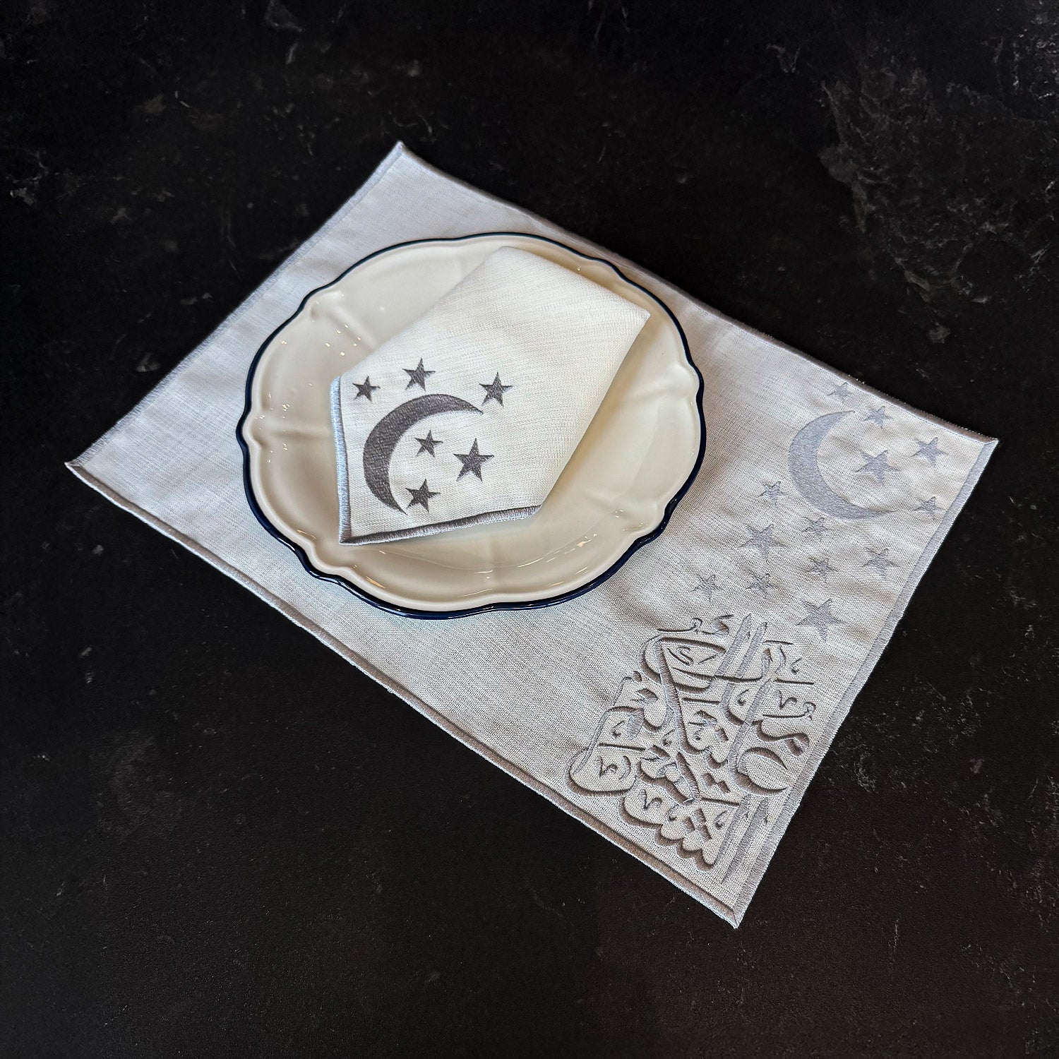 Inspired by elegant Islamic geometric motifs, this 18-piece Ramadan table setting is designed for six people. Each set includes a plate mat, napkin, and cutlery holder, beautifully coordinated in soft fabric with refined gold embroidery.