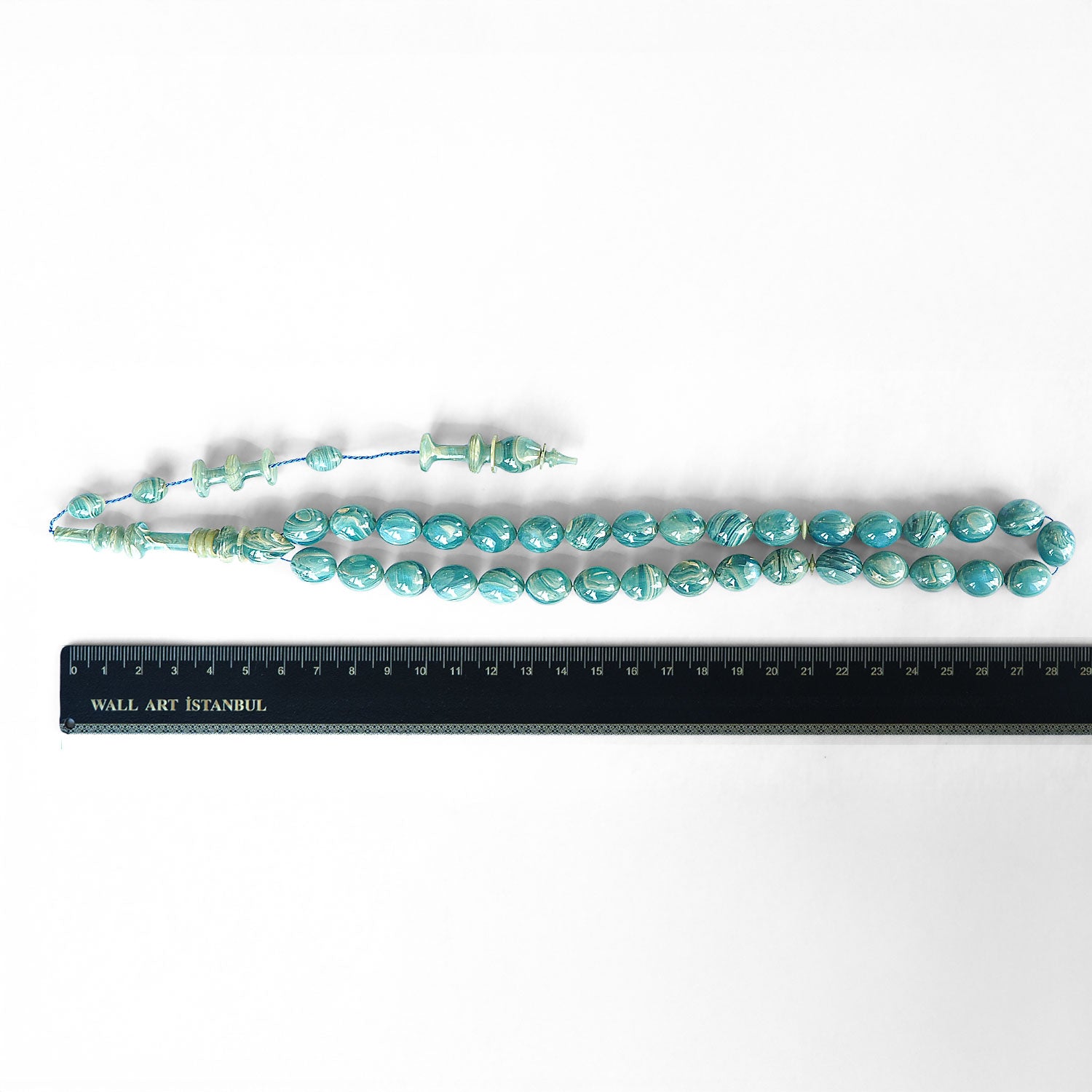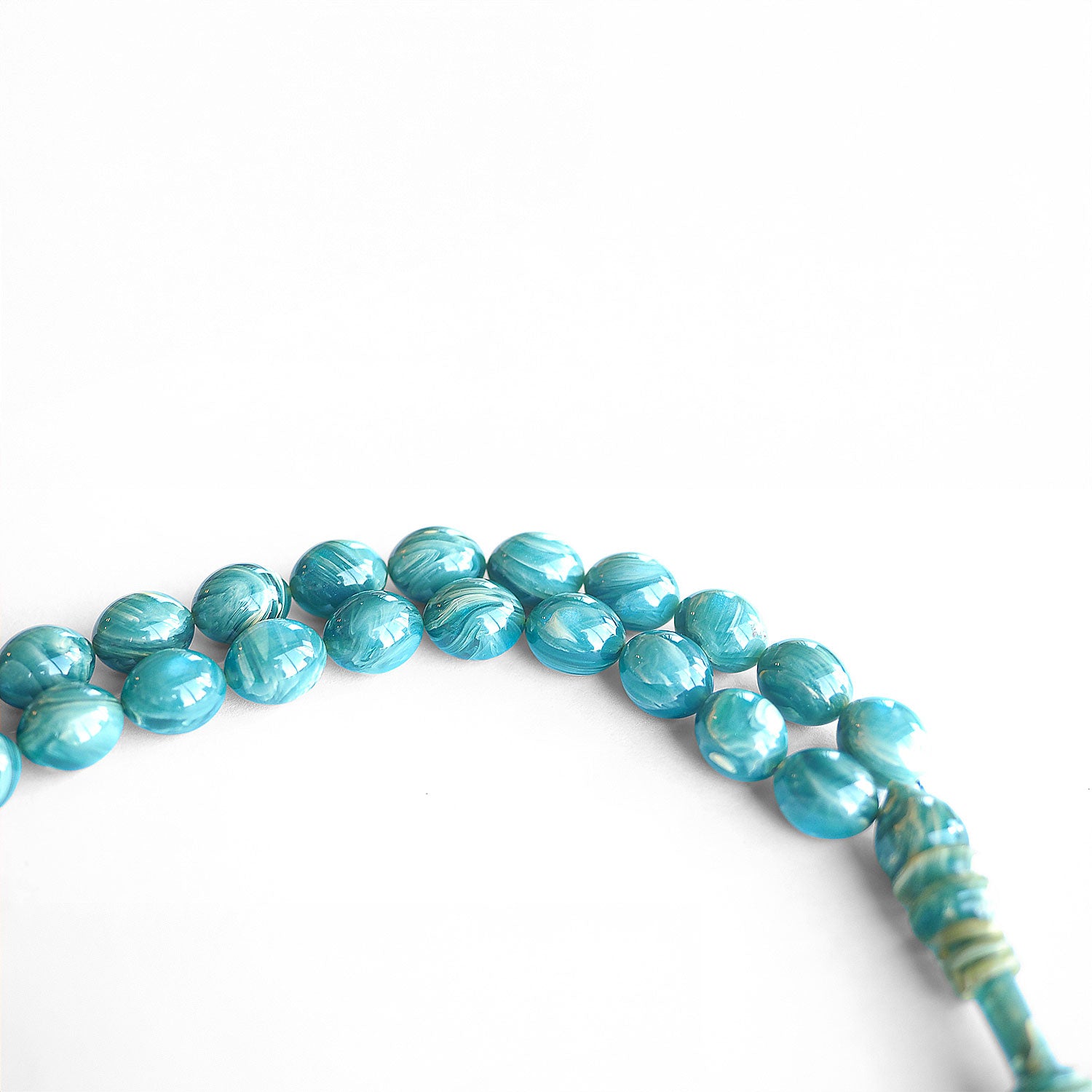 This handcrafted tasbeeh features custom cast Catalin 33 beads with a smooth oval form, offering a balanced presence that combines visual depth with a comfortable, flowing grip.